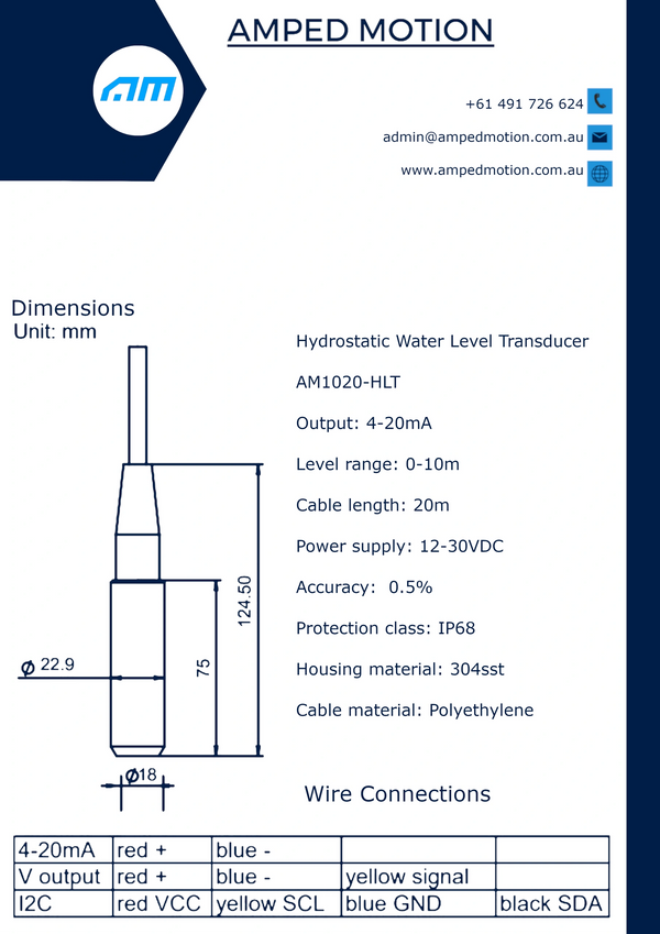 The AM1020-HLT by Amped Motion is a high-accuracy hydrostatic level sensor engineered for measuring water depth up to 10 meters. Designed for harsh environments, it delivers consistent performance in tanks, bores, dams, irrigation channels, and industrial water systems.